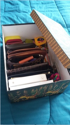 Cuando no salgo de casa, mi bolso permanece vacío, porque desde hace unos dos años implemente en mi día a día el consejo de Marie Kondo «Vacía tu bolso todos los días» y consiste en vaciar todos los días mi bolso y guardar su contenido en una caja, todo se acomoda de manera vertical como se puede ver en las imágenes.